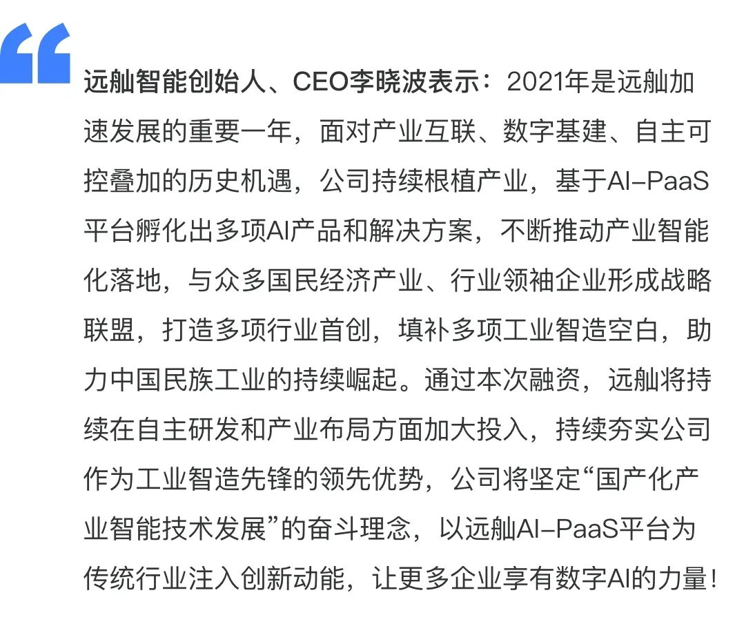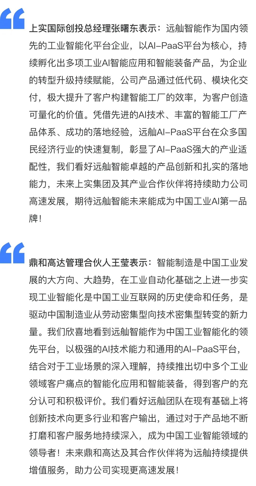 創新型工業AI-PaaS平臺提供商遠舢智能已于近日完成2億元B輪融資,由國內頂級投資機構賽富投資基金領投,上海國資委旗下上實國際創投和國內一線知名機構鼎和高達跟投,同時老股東東方富海、六脈資本持續加碼。頂級創投與頭部產業資本重磅加持,充分驗證了遠舢智能堅定推行的“All in AI& All in PaaS”戰略的成功,進一步鞏固了遠舢在數字化轉型企服市場的引領者位勢。