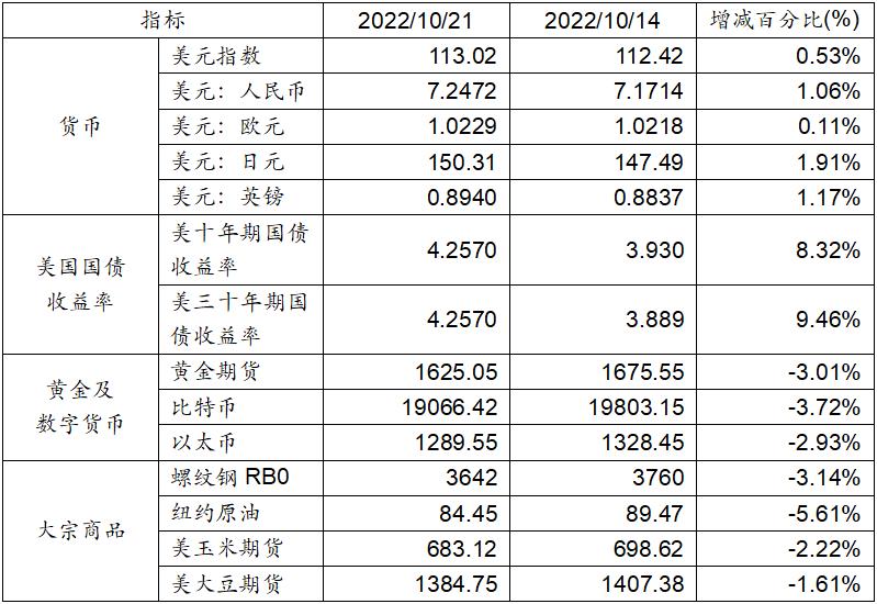 10月14日至10月21日,美元匯率展現(xiàn)強(qiáng)勢表現(xiàn),美元指數(shù)上升0.53%,其中美元兌人民幣匯率上漲1.06%,達(dá)到1:7.2472。美國十年期及三十年國債收益率大漲,分別錄得8.32%和9.16%的上漲表現(xiàn)。黃金期貨、數(shù)字貨幣以及大宗商品則分別呈現(xiàn)下跌態(tài)勢。