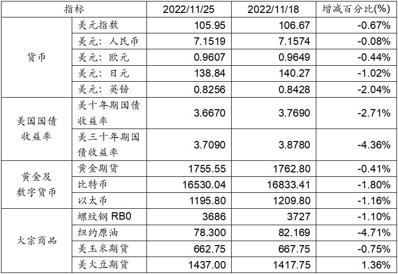 11月18日至11月25日,美元匯率表現繼續走弱,美元指數下跌0.67%,美元兌人民幣匯率下跌0.08%達到1:7.1519。美國十年期及三十年國債收益率持續下跌,分別收跌于3.6670%和3.7090%。黃金期貨價格下跌0.41%。比特幣和以太幣分別下跌1.80%和1.16%。大宗商品當中,除美大豆期貨價格上漲外,螺紋鋼、紐約原油和玉米期貨分別呈現下跌表現。