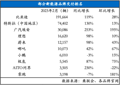 2月新能源車廠商批發滲透率達30.6%,零售滲透率達31.6%,滲透率再次回到30%以上區間。2月新能源乘用車批發49.6萬輛,同比上升56.1%,環比增長27.5%,其中純電動批發銷量34.7萬輛,同比增長41.5%;插電混動批發銷量14.9萬輛,同比增長105.8%。(來源:乘聯會)