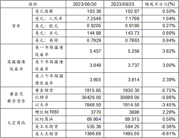 6月25日至6月30日,美元指數(shù)上漲0.50%,美元兌人民幣匯率上漲1.04%達到1:7.2546。美國一年期、十年期及三十年期國債收益率則呈現(xiàn)上漲態(tài)勢。黃金期貨價格下跌0.75%。比特幣下跌0.86%。以太幣下跌3.45%。大宗商品中,螺紋鋼及紐約原油價格上升,而玉米及大豆期貨價格下降。