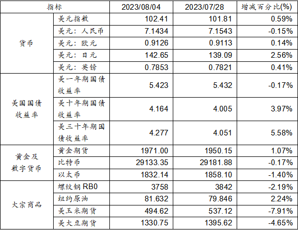 7月28日至8月4日,美元指數(shù)上漲0.59%,美元兌人民幣匯率下跌0.15%達(dá)到1:7.1434。美國(guó)一年期下跌,而十年期、三十年其國(guó)債收益率則呈現(xiàn)上漲態(tài)勢(shì)。黃金期貨價(jià)格上漲1.07%。比特幣下跌0.17%。以太幣下跌1.40%。大宗商品中,紐約原油價(jià)格持續(xù)上漲,而螺紋鋼、玉米期貨及大豆期貨價(jià)格則出現(xiàn)下跌態(tài)勢(shì)。