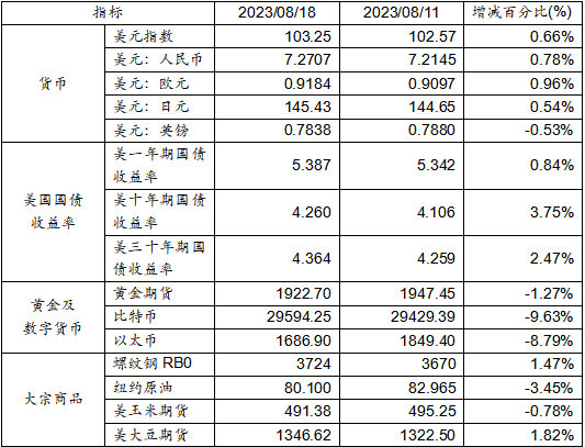 8月11日至8月18日,美元指數(shù)上漲0.16%,美元兌人民幣匯率上漲0.78%達(dá)到1:7.2707。美國一年期、十年期以及三十年其國債收益率均出現(xiàn)上漲。黃金期貨價(jià)格下跌1.27%。比特幣下跌9.63%。以太幣下跌8.79%。大宗商品中,螺紋鋼及大豆期貨價(jià)格出現(xiàn)上漲,,而紐約原油及玉米期貨價(jià)格則呈現(xiàn)下跌。