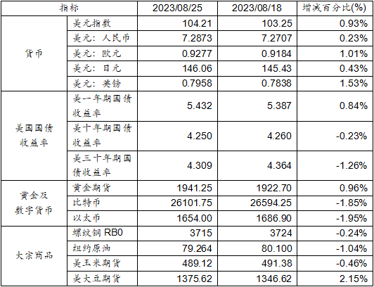 8月18日至8月25日,美元指數上漲0.93%,美元兌人民幣匯率上漲0.23%達到1:7.2873。美國一年期國債收益率上漲,而十年期以及三十年則出現下跌。黃金期貨價格上漲0.96%。比特幣下跌1.85%。以太幣下跌1.95%。大宗商品中,大豆期貨價格上漲,而螺紋鋼、紐約原油及玉米期貨價格則呈現下跌。