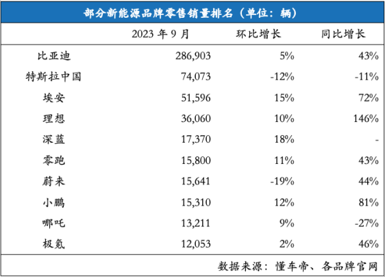部分新能源品牌具體零售銷量如下: