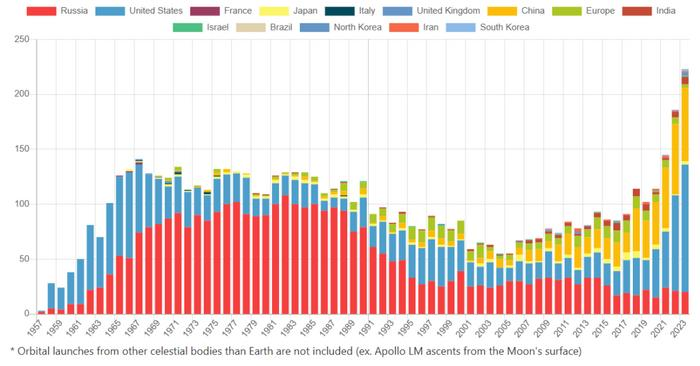 2023年全球軌道級發射再破新高達到223發,中國的火箭發射刷新2022年的64發紀錄,達到67發,僅次于美國的116發,位居全球第二。