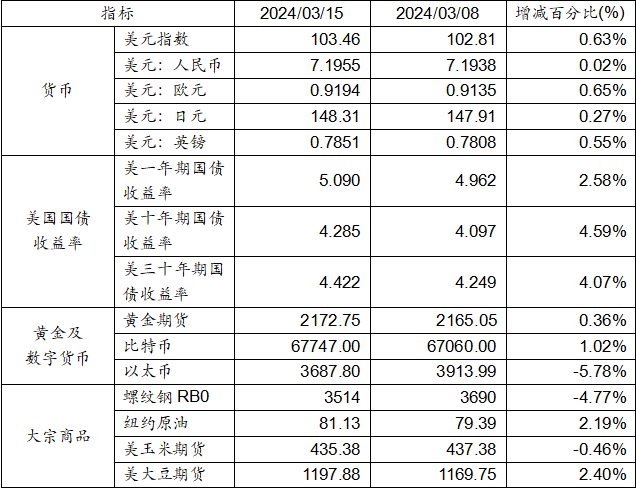 3月8日至3月15日,美元指數上漲0.63%,美元兌人民幣匯率上漲0.02%達到1:7.1955。美國一年期、十年期及三十年期國債收益率均有所上漲。黃金期貨價格上漲0.36%。比特幣上漲1.02%。以太幣下跌5.78%。大宗商品中,螺紋鋼及玉米期貨價格下跌,而大豆期貨及紐約原油價格呈現上漲態勢。