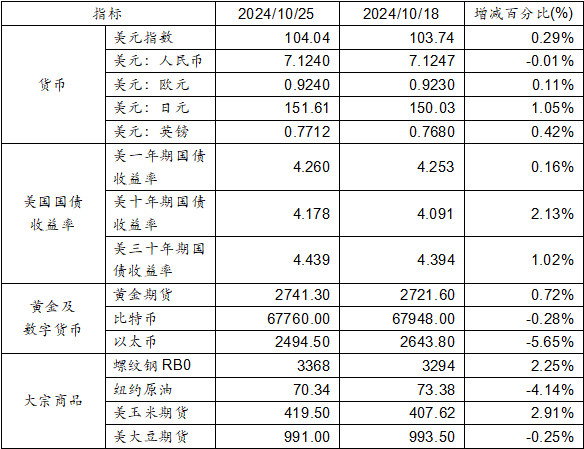10月18日至10月25日,美元指數(shù)上漲0.29%,美元兌人民幣匯率下跌 0.01%至1:7.1240。美國(guó)一年期國(guó)債、十年期及三十年期國(guó)債收益率均呈現(xiàn)上漲態(tài)勢(shì)。黃金期貨價(jià)格上漲0.72%。比特幣下跌0.28%。以太幣下跌5.65%。大宗商品中螺紋鋼、玉米期貨價(jià)格上漲,而紐約原油及大豆期貨價(jià)格則下跌。