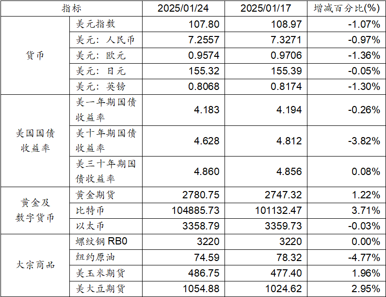 1月17日至1月24日,美元指數下跌1.07%,美元兌人民幣匯率下跌0.97%。美國一年期及十年期國債收益率下跌,而三十年期國債收益率則呈現上漲態勢。黃金期貨價格上漲1.22%。比特幣上漲3.71%。以太幣下跌0.03%。大宗商品中紐約原油價格下跌,而大豆期貨及玉米期貨的價格則呈現上漲態勢。