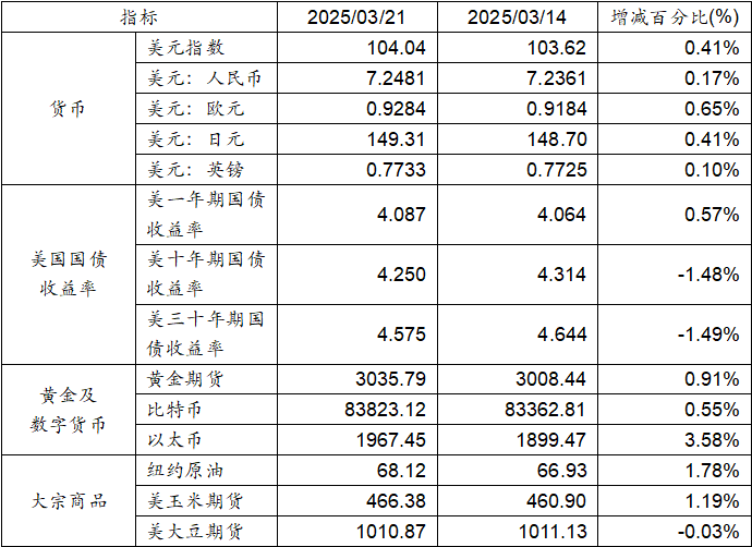 3月14日至3月21日,美元指數上漲0.41%,美元兌人民幣匯率上漲0.17%。美國一年期國債收益率上漲,而十年期及三十年期國債收益率則呈現下跌態勢。黃金期貨價格上漲0.91%。比特幣上漲0.55%。以太幣上漲3.58%。大宗商品中紐約原油和玉米期貨價格上漲,而大豆期貨價格則有所下跌。
