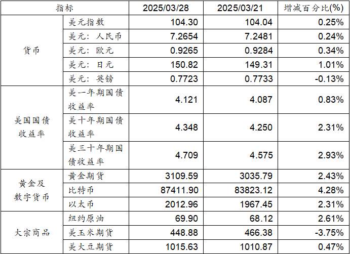 3月14日至3月21日,美元指數上漲0.41%,美元兌人民幣匯率上漲0.17%。美國一年期國債收益率上漲,而十年期及三十年期國債收益率則呈現下跌態勢。黃金期貨價格上漲0.91%。比特幣上漲0.55%。以太幣上漲3.58%。大宗商品中紐約原油和玉米期貨價格上漲,而大豆期貨價格則有所下跌。