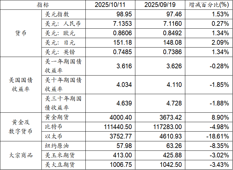 9月19日至10月11日,美元指數(shù)上漲1.53%,美元兌人民幣匯率上漲0.27%。美國一年期、十年期及三十年期國債收益率均呈現(xiàn)下跌態(tài)勢。黃金期貨價(jià)格上漲8.90%。比特幣下跌4.98%。以太幣下跌18.61%。大宗商品中紐約原油、大豆期貨及玉米期貨價(jià)格均呈現(xiàn)下跌態(tài)勢。